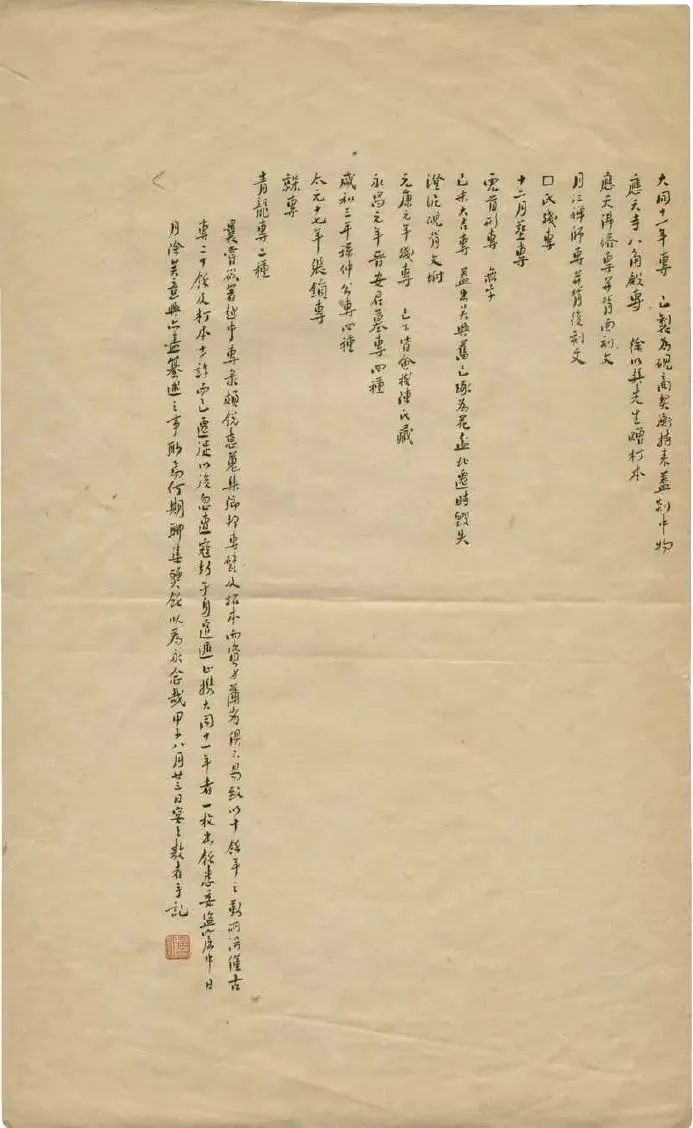 曩嘗欲著《越中專錄》,頗銳意蒐集鄉邦專甓及拓本,而資力薄劣,俱不易致。以十余年之勤,所得僅古專二十余及朾本少許而已。遷徙以后,忽遭寇劫,孑身逭遁,止攜大同十一年者一枚出,余悉委盜窟中。日月除矣,意興亦盡,纂述之事,渺焉何期?聊集燹余,以為永念哉!甲子八月廿三日,宴之敖者手記。[31]