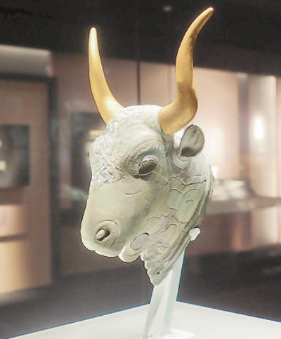 一件距今約3500年的公牛頭形綠泥石來通杯引人注目?!皝硗ā币辉~源于希臘語,意為“流淌”。很多古代文明都把來通杯用作祭酒器,其最大特征是器身上有注液口和出液口。這件公牛頭形來通杯注水口位于后頸部和左側牛角處,出水孔位于牛嘴。牛頭面部的毛發刻畫細膩,額頭處可見螺形發旋。獸頭形來通杯是一種珍貴物品,常被克里特島的統治者作為外交禮物贈送給他國。希臘大陸出土的牛頭形來通杯和埃及第十八王朝法老墓壁畫上的來通杯圖像表明,這種器物在克里特島與地中海東部其他文明的交往中扮演了重要角色。