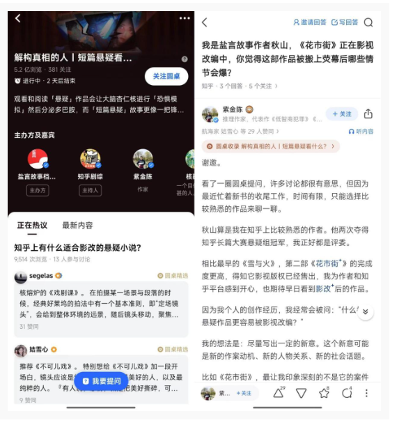 世界讀書日前夕,鹽言故事在知乎社區發起懸疑故事線上圓桌,知名懸疑作家紫金陳與眾多鹽言故事作者、文學及影視領域答主一起,圍繞懸疑短篇故事及影視化空間展開討論,吸引懸疑創作者和廣大懸疑愛好者的關注。