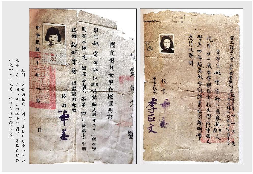 左圖:姚云的在校證明書,開具日期為一九四九年一月。右圖:姚云的肄業證明書,開具日期為一九四九年七月。均選自金宇澄《回望》