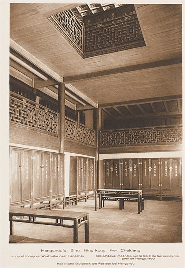 1909年拍攝的文瀾閣內部,《四庫全書》和書櫥都在。