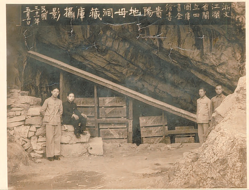 1942年浙江圖書館工作人員與精心保管的文瀾閣《四庫全書》在貴陽地母洞中合影