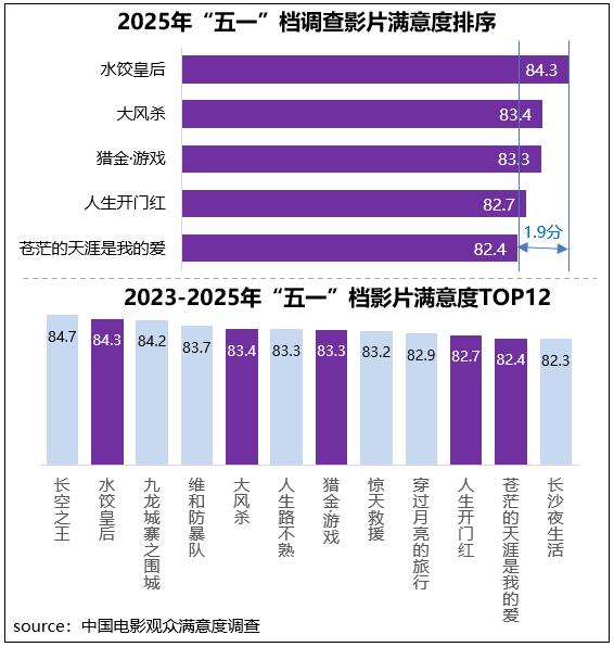 中國電影觀眾滿意度調查?2025年“五一”檔調查結果顯示,“五一”檔電影觀眾滿意度得分83.6分,同比增長0.4分,為近年來同期調查的春季及“五一”檔期滿意度第一位。2025年“五一”檔電影市場延續多元化內容供給,滿意度主調查的五部影片類型題材各異,且都以較為優質的創作獲得了觀眾“滿意”評價,并首次實現在“五一”檔主調查的影片全員突破82分,其中《水餃皇后》以84.3分奪得檔期冠軍,《大風殺》、《獵金?游戲》分別以83.4分、83.3分居第二、第三位。