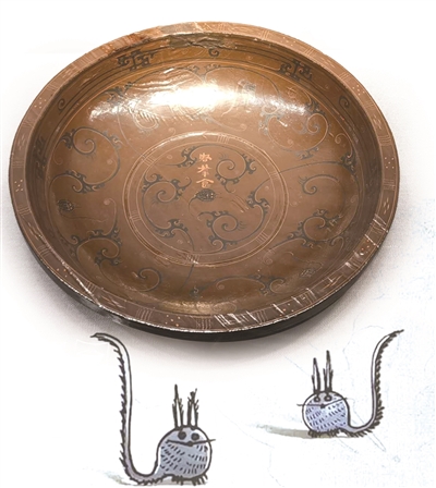 “君幸食”貍貓紋漆食盤與其中的貍貓紋樣。