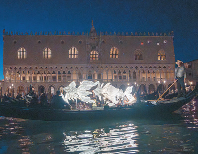 本屆威尼斯國際建筑雙年展期間,在威尼斯貢多拉船布置的“流動的塱頭”藝術裝置。