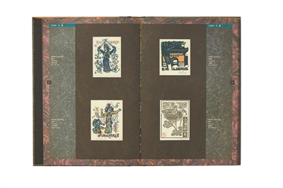 自書籍之美角度觀之,《國際藏書票精選》可謂遙遙領先。此書正文頁面先印深色底紋,再將彩色藏書票印于其上,隨手翻開任何一頁,都感覺仿佛是在窺視私人相冊。此書的精裝加平裝雙封面設計與裝訂,也成了幾年后寧成春先生在北京整體設計豪華典藏版《莎士比亞畫廊》時的靈感來源。