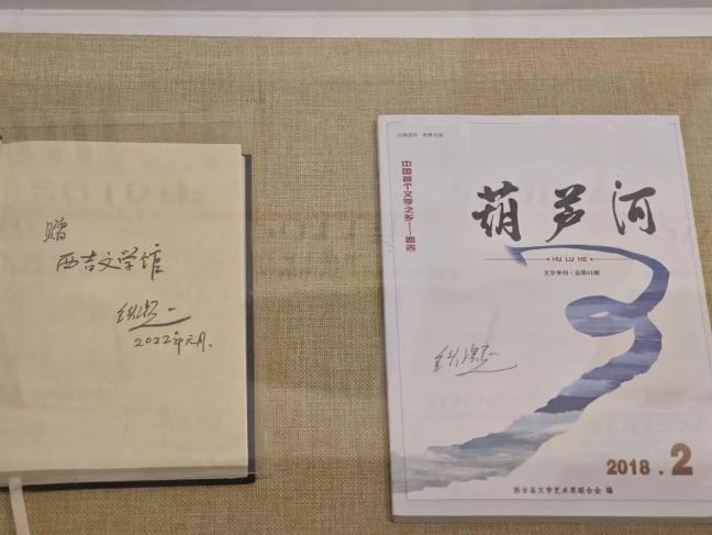 西吉文學館內展出鐵凝在封面簽名的文學內刊《葫蘆河》