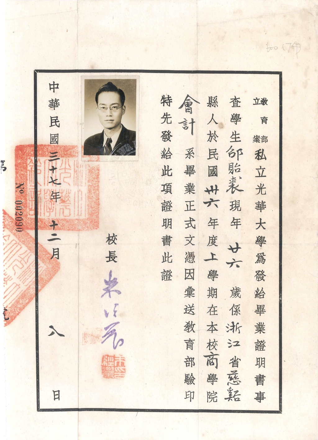查學生邵貽裘現年廿六歲,系浙江慈溪縣人。于民國卅六年度上學期在本校商學院會計系畢業,正式文憑因匯送教育部驗印,特先發給此項證明書,此證。