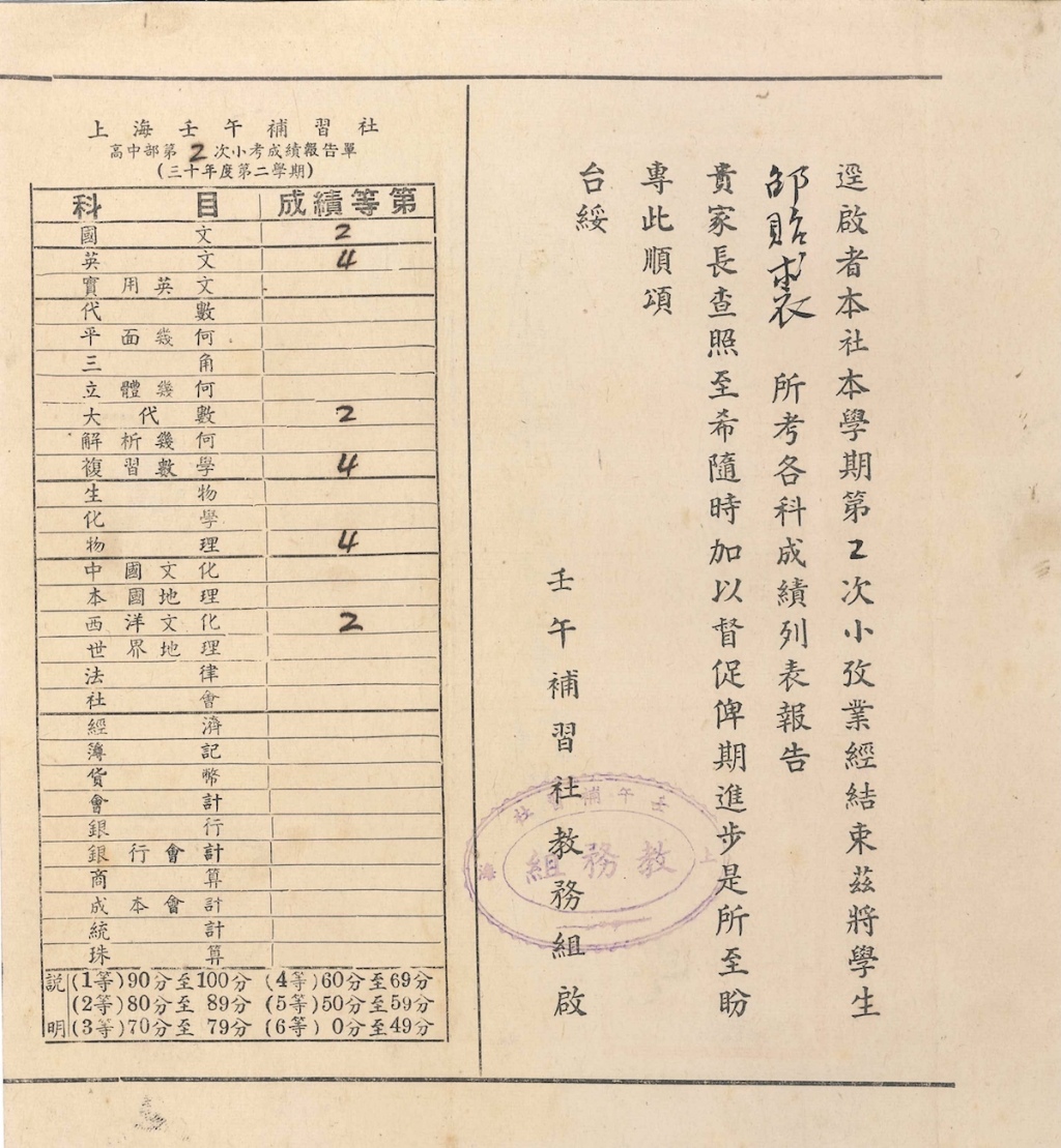 邵貽裘1938年從光華初中畢業,那他是不是繼續在光華高中讀書呢?要解答這一問題,我們在這批邵貽裘的文獻中找到一件題為《壬午補習社高中部第2次小考成績報告單》的文獻,這一成績單的內容見下:
