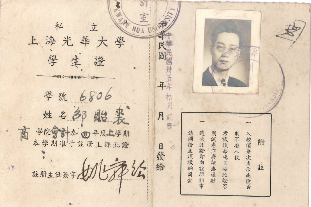 1945年抗日戰爭勝利,因當時上海商業較發達,父親又從事商業,認為學習商科有出路,因此轉入本市漢口路證券大樓私立光華大學商學院會計系三年級讀書,學習頗有成績。1947年8月擔任光華大學商學院會計系助理,1947年12月大學畢業。因學習成績優良,本校留用,擔任光華大學商學院會計系專任助教及講師職,直至上海解放。