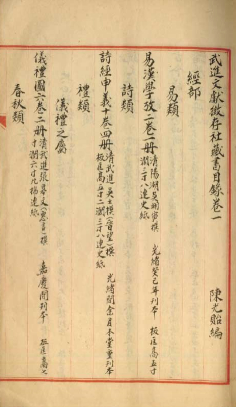 武進文獻征存社的藏品到底有哪些?從《蔣維喬日記》中只知有書籍、甲骨文,詳細名目無從得見。所幸陳光貽所編的《武進文獻征存社藏書目錄》稿本,完好保存在上海圖書館。此目寫于半頁十行的朱絲欄稿紙上,書前有凡例、總目。按凡例稱,全目分類采用江蘇省立國學圖書館法,略加增并,全書分為三卷,第一卷列朝鄉先哲撰著書籍、稿本及有關武進文獻的材料,第二卷全國古今學者著述書籍、稿本及叢書、雜志,第三卷文獻、文物。卷一、卷二按經、史、子、集、叢五部分類,雜志附于卷二最后。卷三主要分為兩類,文物是指商卜甲骨片,文獻是指內閣大庫要檔。卷一、卷二兩卷中著錄的藏書,普通版本居多,偶有明刻本及清人稿本,據我所知張武曾《說文證異》稿本五卷有吳大澂題跋者、繆荃孫舊藏《咸淳毘陵志》舊抄本、趙烈文《落花春雨巢日記》稿本五冊、趙烈文《能靜居士日記》趙寬抄稿本五十四冊、趙烈文《趙惠甫手札》手箋裝裱本一冊、錢大昕校跋舊抄本《大金國志》、沈廷芳舊藏清抄本《高麗國史》三十二冊、舊抄本《楊大洪忠烈實錄》三冊等,現均藏于南京圖書館。卷二史部金石類自第一種《藝風堂金石文字目》至最后一種《續殷文存》共計七十二種,書名上方均畫○,同樣畫圈的是卷三殷墟商卜甲骨片三宗:
