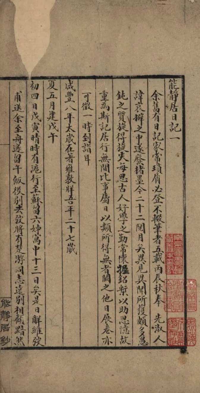 能靜居士日記五十四冊 清武進趙烈文(惠甫)撰 稿本 自咸豐八年五月初四日至光緒十五年六月二十止?;莞Χ邭q至五十八歲間日記。自咸豐八年至同治五年間書稿名“能靜居鈔”,每半頁十行,直行格本。自同治五年十二月至光緒十五年六月,書稿名“亦龍亦蠖之居”,每半頁十三行,方格本。兩種皆毛邊紙,未裝釘。