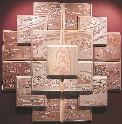 “披云似有凌霄志,向日寧無捧日心?!绷柘龌ㄗ怨艦槿藗冪姁?,付云飛在邂逅的剎那就愛上了它,飽含熱情畫下了大尺幅的《山花爛漫》。朱砂渲染的絢爛花簇從一整塊大石上披掛、垂落下來,洋洋灑灑,頗為可觀,大寫意的山石構制,間以小寫意的筆觸點染,疏朗大氣之中,不失優雅與浪漫。恣意綻放的花朵和遒勁有力的藤蔓,被大石整合在一個完整的畫面之內,與石上山雀相呼應,傳遞出中國畫形神兼備、虛實相生的筆墨意趣和人文內涵?!斗谴朔潜恕窂钠椒仓邪l掘美。拋開一切附加之物,站在21塊棕色調正方板材錯落排布的作品前,舒服和美之感油然而生。天然的紋理、如詩的圖案、和諧的色彩,均由作者在廉價的三合板上完成。在手工拋光至兩萬目后,這些久被忽視的板材逐次蘇醒、開口歌唱,既袒露出樸拙的表情和天然的紋理,順著紋理雕刻下去,又袒露出深淺不一的豐富色彩??痰吨掳纪褂兄?,宛若天成,不著痕跡,遠觀如長河落日的荒漠大野,又如混沌初開的天地造化,莊嚴神秘又靈動不拘,層層解構,層層驚喜,是藝術家匠心獨具的創造,亦是板材久被遮蔽的本有詩意。