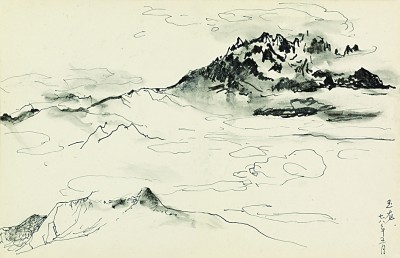 其間,吳冠中連續一個多星期冒雨在玉龍雪山寫生,只為捕捉雪山最真實的面貌與氣韻。他頂風冒雨,衣履盡濕,卻始終不曾放下畫筆。在他的藝術人生中,這是一次飽含虔誠與執著的山水朝圣,也是一場屬于畫者與自然之間的深情凝視。那些誕生于雨霧之中的作品,被他視作珍寶?!对颇闲小分忻枥L玉龍雪山的速寫寫生有7張之多,每一幅都顯現出他對自然萬象的敏銳感知和獨到表現。他用靈動的線條勾勒出雪山連綿起伏的脊線,筆觸輕盈而不失力度,極具節奏韻律。與傳統山水畫不同的是,他運用現代構成理念,將“寫意”與“寫形”融為一體。在描繪雪山氤氳霧氣時,他更是以指代筆,用沾有淡墨的指腹在紙面上反復揉搓,形成云氣繚繞、山色朦朧的視覺效果,使畫面呈現出介于具象與抽象之間的微妙張力。這些速寫作品中,黑與白的碰撞、線與面的交融、動與靜的對比,被吳冠中巧妙地組織在有限的畫幅中,構成強烈的視覺節奏與空間起伏感。他擅長在“空”中見“實”,以極簡的筆墨營造出極富厚度的山岳氛圍,使玉龍雪山在畫中呈現出既高遠又飄逸、既雄渾又婉約的多重表情。這種速寫風格并非單純記錄景致,更是吳冠中藝術理念的深度體現,速寫不在于速,而在于寫——寫境、寫神、寫意。他的速寫,是創作的“胚胎”和“構思之母”,更是自由心靈的產物。