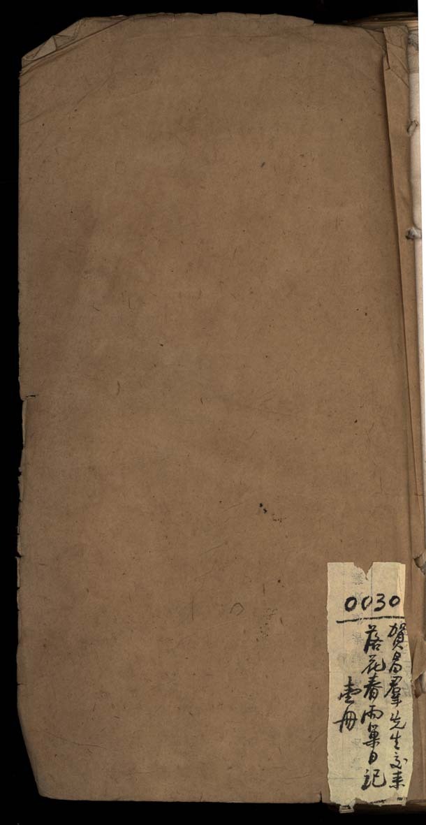 此本同樣也沒有“毗陵文獻征存社”印,冊末有一“南京古□書店”牌記,內中填有“書號33127 冊數1 定價100、00”,封底有一粘條:“賀昌群先生交來落花春雨巢日記壹冊”(圖7)。賀昌群1950年曾任南京圖書館館長,1953年調任(蘇健、趙曉虹《國家圖書館學人著述目錄1909—1949》),該抄本可能是由他在這三年間,從南京古舊書店購入再親自交給南圖的,至此,趙烈文最重要的日記稿抄本,由常熟到上海,再到南京合璧,應該也算是文獻流傳史上的一段嘉話吧。只是其中的人事細節,卻早已淹沒于時間的洪流之中,引起后人無窮的興嘆。