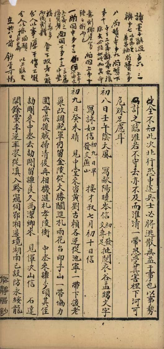 此外,鈔本《能靜居日記》上除了趙寬、徐震二人的校語外,還附有一些供人編選的簽條,如第四冊咸豐十年三月初四日上有毛筆、鋼筆簽條各一(圖6),毛筆云“子良來自浙至不忍更聞矣選”,鋼筆云“從第十行‘初四日’句抄起,至第二頁第九行‘不忍更聞矣’句止”。趙烈文曾節選其咸豐十年太平軍攻占浙江的部分成《趙偉甫先生庚申避難日記》在民國六年(1917)《小說月報》第八卷第一二三期上連載,毛筆簽條或即供此日記摘抄;而鋼筆簽條起止諸句內容(不止一條),俱見羅爾綱所編《太平天國史料匯編》史部雜史類,故鋼筆簽條可能出于羅爾綱先生本人或轉托謄抄人之手。