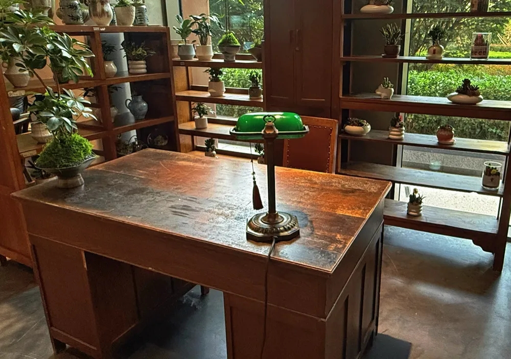 一層右側的朝花夕拾·文創咖啡供銷社率先開業,空間敞亮,更顯古樸雅致。店門口,一套從朝內166搬來的辦公桌椅和書架靜靜陳列,桌上那盞熟悉的綠色玻璃罩臺燈,柔光流淌,瞬間將人拉回朝內166的舊時光——仿佛一切從未改變。