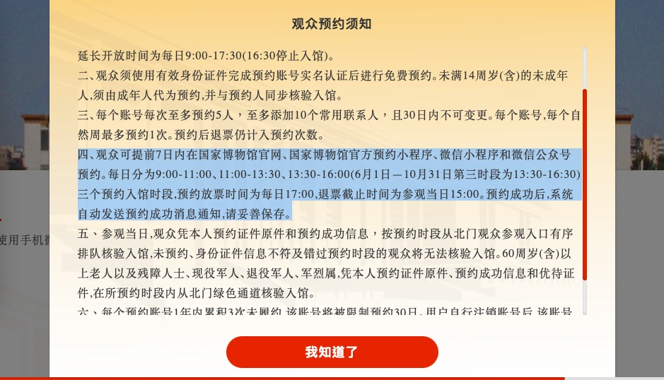 澎湃新聞記者登錄國家博物館的官網可以看到條分縷析的“觀眾預約須知”,其中,最為重要的說明是“預約入館時段,預約放票時間為每日17:00,退票截止時間為參觀當日15:00?!边@意味著,在火熱的暑假時段,觀眾需要在預計參觀日提前七天的17:00卡點刷新網站,才有可能預約到門票。