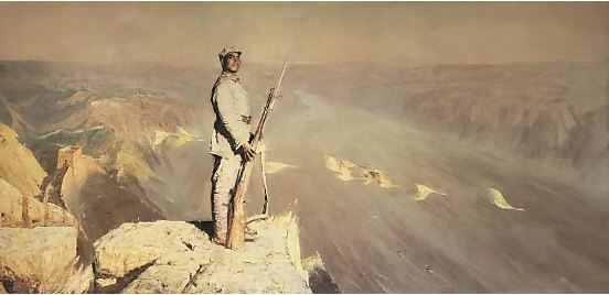 這種針對人物姿態的藝術修辭亦可見于《黃河頌》與《占領總統府》?!饵S河頌》以八路軍戰士為主體,描繪了抗戰期間八路軍戰士從容自信的姿態。背景中,凝結成線狀的黃河奔流于峽谷,呼應了歌曲《黃河》的音樂性?!墩碱I總統府》描繪渡江戰役后解放軍戰士攻入南京總統府、升起紅旗的場面。明暗法的使用強化了畫面的敘事性。光影與姿態的結合,使人自然聯想到浪漫主義畫家歐仁·德拉克羅瓦作于19世紀的《自由引導人民》。二者同樣憑借象征性的姿態與幾何構圖,激發起觀者深刻的情感共鳴。