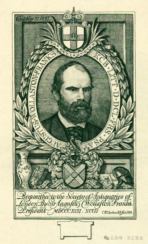 有“大英博物館第二創始人”之稱的弗朗克斯是當時收藏藏書票數量最多的個人。這是用于弗朗克斯遺贈倫敦古物學會書籍所用的藏書票,在票主去世次年作成。中央橢圓框內是弗朗克斯肖像,沿像框的文字是“奧古斯都·沃拉斯頓·弗朗克斯,巴斯騎士,文學博士,民法博士,皇家學會會員,古物學會主席”。上方為倫敦古物學會紋章,有學會的拉丁文銘文“綿延不絕”;下方為弗朗克斯紋章,銘文為“暫得于己倏忽去之”,其兩邊有花瓶、書籍、藏書票冊等。下部文字寫明遺贈之事:由1892—1897年主席奧古斯都·沃拉斯頓·弗朗克斯爵士遺贈倫敦古物學會。后接藏書票作者署名。矩形外框左上角有拉丁文:1897年5月21日去世。