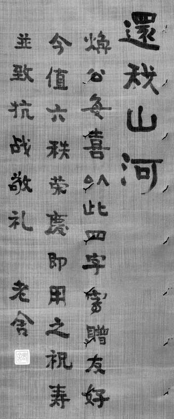 抗戰期間,馮玉祥將軍六十歲生日時,老舍書“還我山河”祝壽并致抗戰敬禮。
