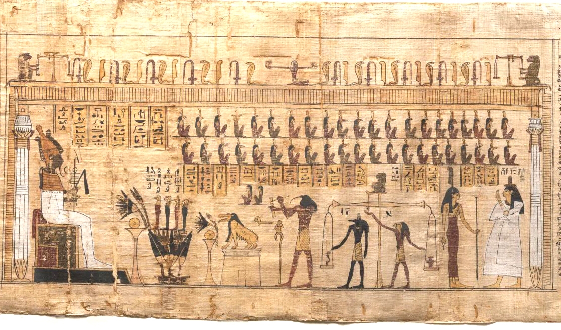 復活后的奧西里斯成為冥界之神,頭戴阿太夫冠,留著長長的胡須,一身綠皮膚或黑皮膚,手里拿著鉤形赫卡權杖和連枷。埃及最常見的伴手禮是紙莎草畫,上面畫著《亡靈書》?!锻鲮`書》又叫《死者之書》,記載了古埃及人關于死后獲得永生的操作方法和咒語。在埃及神話中,奧西里斯的審判大廳是決定能否重獲新生的地點。大廳中央放著一架天平,一端放著象征正義的瑪特羽毛,另一端放上亡靈的心臟,如果心臟重于羽毛,那么亡靈就失去了重生的機會。稱心儀式的場景算是紙莎草畫上常見的繪圖之一。