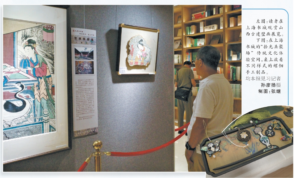 左圖:讀者在上海書城觀賞山西古建壁畫展覽。下圖:在上海書城的“拾光共聚場”傳統文化體驗空間,桌上放著不同樣式的螺鈿手工制品。均本報見習記者孫彥揚攝