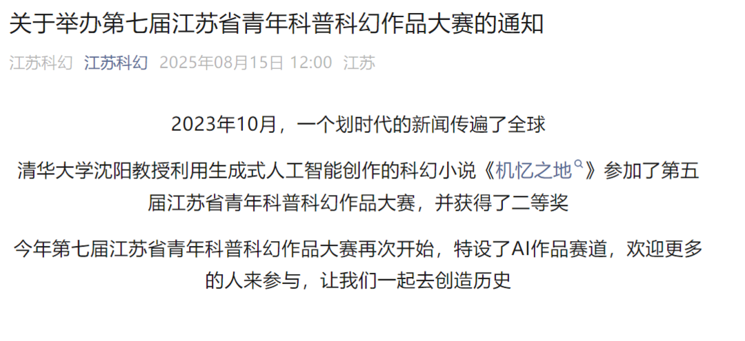 AI科幻作品賽道的出現源于2023年清華大學沈陽教授在參加第五屆江蘇省青年科普科幻作品大賽時的獲獎作品《機憶之地》,該作品是利用生成式人工智能進行的創作,付昌義表示,設置這一賽道主要是出于三方面考慮:“一是科幻的核心是探討科技與人類未來的關系。AI 賽道直接呼應了當下人工智能倫理、人機關系、后人類主義等熱門議題,讓作品更具現實關聯性。二是 AI 技術正在改變我們的創作方式。比賽通過增設賽道,推動創作者探索人機協作的新模式,拓展科幻表達的邊界。比如AI可能提供人類難以想到的情節設定或視覺設計,而人類負責把控主題和情感深度。三是回應與深化當下關于AI創作的爭議性討論。比如AI 生成內容如何定義原創性?人類作者的核心價值是什么?人類的創作能力是否被稀釋? 也許優秀的 AI 賽道作品,正可以展現人類主導的不可替代性?!?/p>