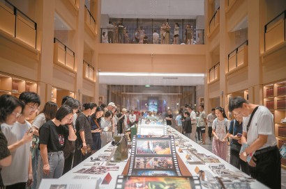 走進徐家匯書院,一樓中庭的長桌上,“拾光匯影——紀念中國電影誕生120周年特展”復現了一條影視長河,呈現了徐匯的電影公司、電影人物的歷史以及與電影有關的建筑故事。當晚,徐家匯書院的每個區域都精心布置了與電影相關的互動體驗,令人仿佛置身于一個光影交織的世界,每位參與者既是觀眾也是演員,既是讀者也是作者。各個樓層之間以《大鬧天宮》《好東西》《郵緣》《聶耳》四部具有徐匯元素的電影進行串聯,還設置了“電影可描摹”場景打卡、電影街區地圖以及邂逅電影NPC等環節。