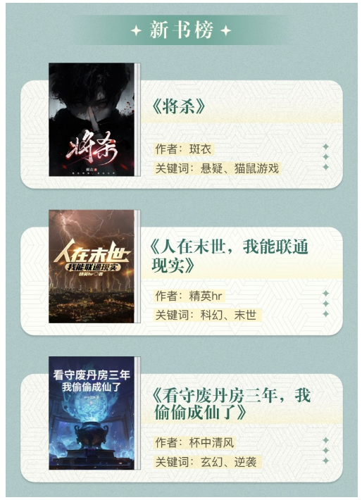 在新書榜中,三部新作使用了創新的敘事與結構。懸疑探案作品《將殺》設定主角患上“間歇性失憶癥”形成“不可靠敘事”,引導讀者在反轉中重構對人物與案件的認知;《人在末世,我能聯通現實》以獨特的雙時空設定突破傳統末世題材的敘事窠臼,構建出跨越十余年時空的協作與互助框架;《看守廢丹房三年,我偷偷成仙了》巧妙融合修仙元素與現代網文爽感邏輯,使故事呈現獨特節奏和層次感。