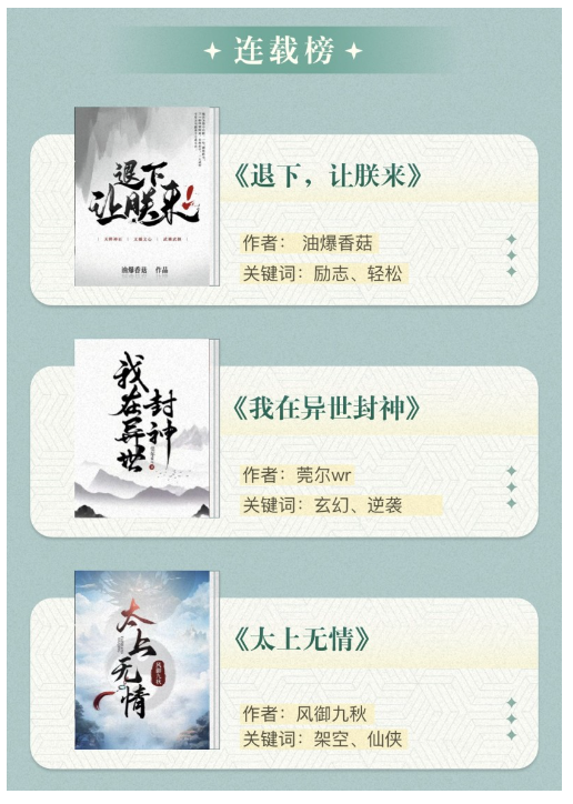 榜單延續遴選兼具文化深度與市場潛質的優質佳作的核心理念,持續彰顯平臺在網絡文學價值引領上的恒心與定力。本期上榜作品經過精心篩選,既展現出當下網絡文學在題材與風格上的多元探索,也在專家評審的深度解讀下,進一步釋放其文學魅力與行業價值。