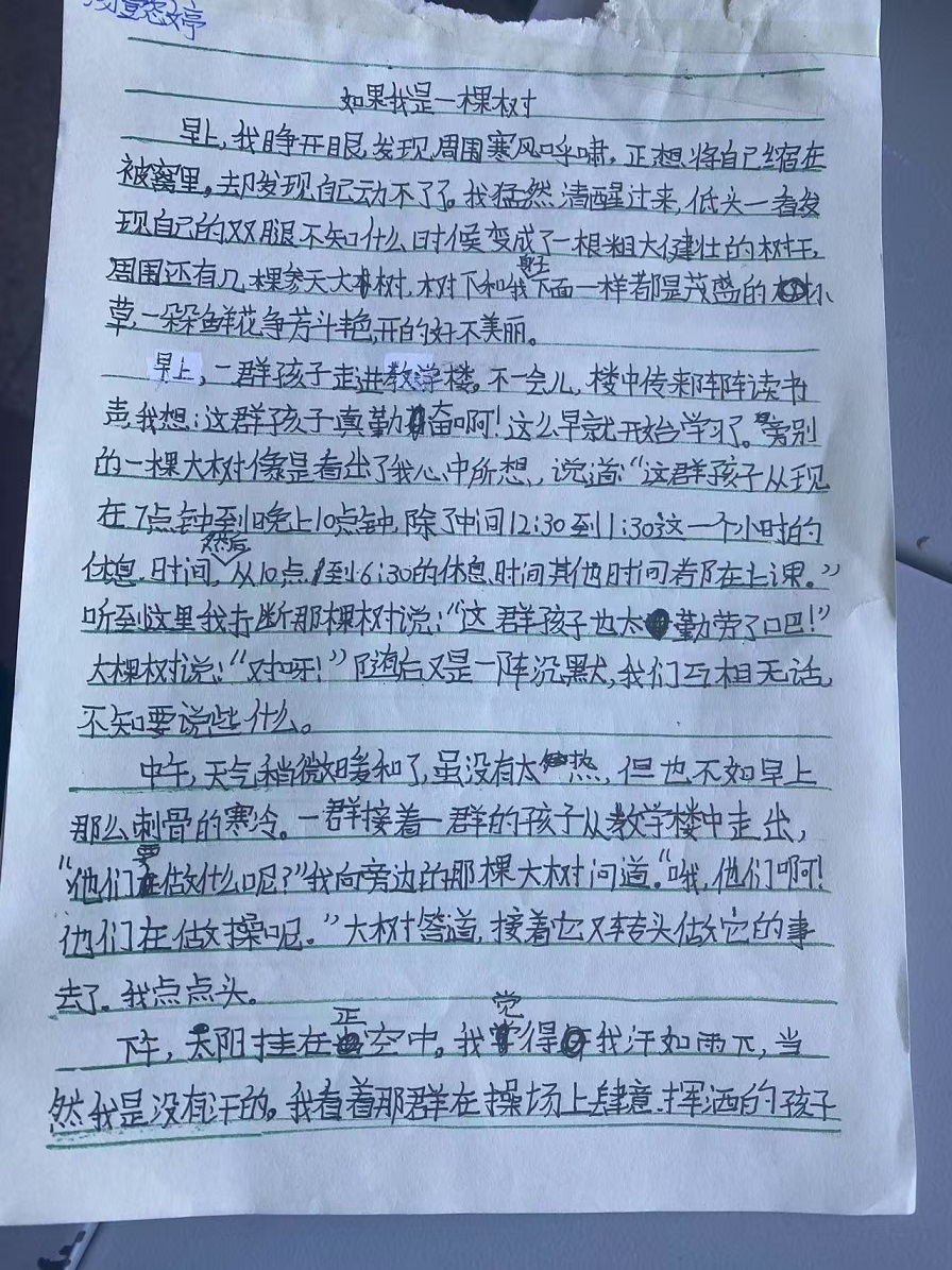 這是左昡的“創作實驗”:她帶著孩子們觀察樹、觸摸樹,有的孩子甚至嘗試了啃樹皮……在嘻嘻哈哈的打鬧中,孩子們的感官世界被打開,與大自然相擁?;氐浇淌?,她在黑板上寫下作文題:如果我是一棵樹。孩子們瞬間安靜下來,教室里安靜到只聽見紙筆摩擦沙沙的聲音。