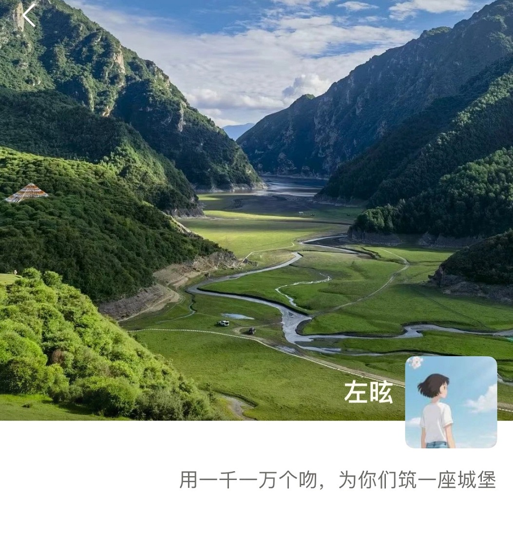 點開左昡的朋友圈,她的背景圖展示的是四面環山中的蜿蜒公路,這是臨潭冶力關的風景。底下的簽名寫道:“用一千一萬個吻,為你們筑一座城堡?!?/p>