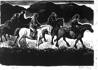 古安村:1991年底,古元被確診為癌癥晚期。20世紀90年代,古元不僅創作了一批黃河題材作品,還創作了一批駱駝題材作品。實際上,這些創作都是他在術后對人生和自我的重新審視。人生既有美好安靜的順流,也有異常艱難的逆流、漩渦和淺灘。在創作《激流勇進》時,古元已歷經四次化療,身體極度虛弱。然而,他以頑強的意志力堅持創作,通過描繪黃河漩渦與逆流而上的纖夫等意象,藝術化地傳達了其戰勝病魔的精神信念。此時,他還創作了《西出陽關》等駱駝題材作品,刻畫了駝隊在荒漠風沙中艱難跋涉的視覺意象,同樣呈現出古元強烈的精神訴求。駱駝題材作品與黃河題材作品彼此呼應,共同體現了古元晚期創作中的生命哲學思考。駱駝堅韌前行的精神、黃河激流勇進的精神,不僅體現了古元個人的生命哲學思考,也升華為對民族精神與抗戰記憶的藝術詮釋。