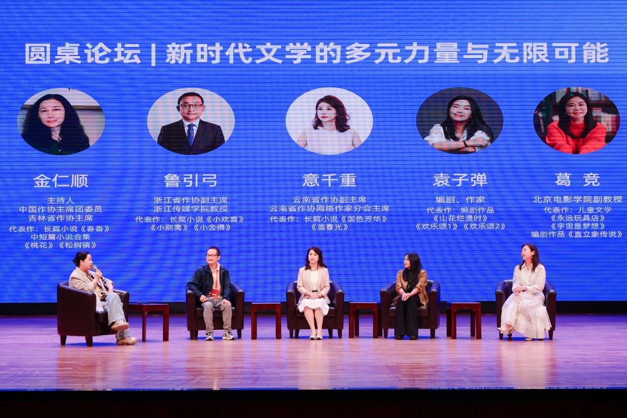 開幕式后舉行了圓桌論壇對話活動,金仁順主持論壇。上半場論壇以“新時代文學的多元力量與無限可能”為主題,魯引弓、意千重、袁子彈、葛競圍繞主題展開對談。大家談到,文學創作的可能性建立在深入生活、深入史料的基礎上,只有下大力氣去了解書寫對象的來龍去脈,才有可能將作品寫得真實動人。面對短劇的沖擊,今天的影視行業創作者應當堅守自身的特色與審美,兒童題材作品更需要進一步加強想象力和創造力,深挖中華優秀傳統文化,找到傳統文化與現實生活相結合的有效路徑。