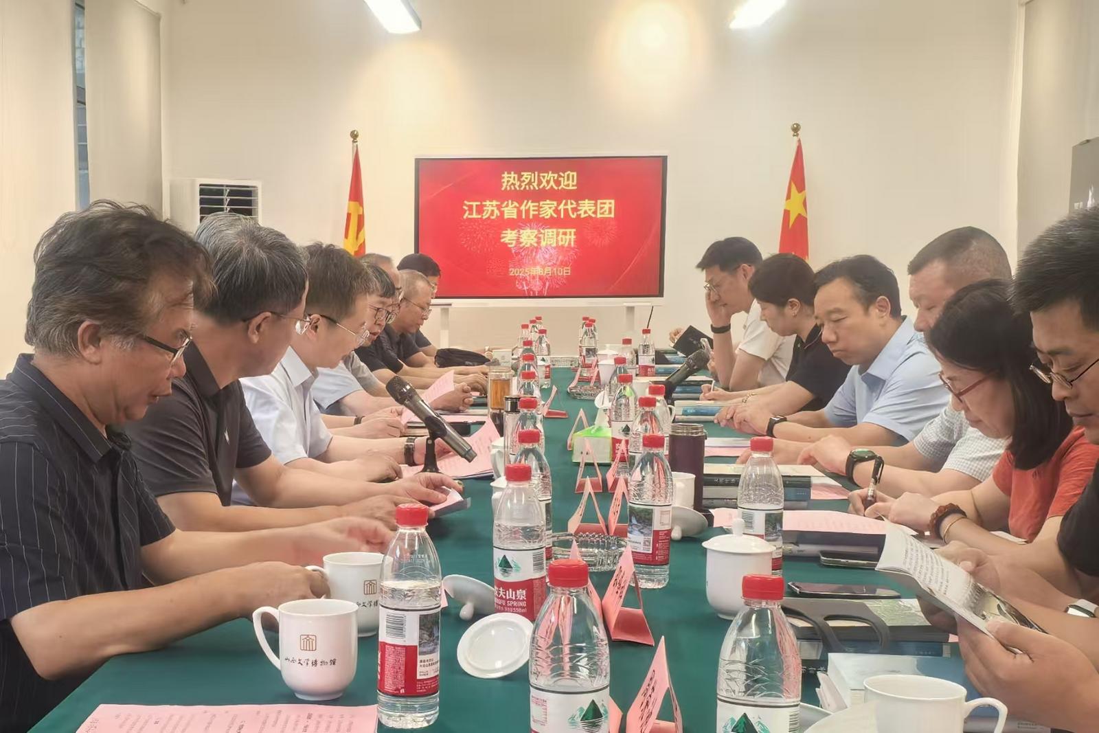 8月10日下午,江蘇省作協黨組書記、書記處第一書記、副主席鄭焱帶領江蘇40余位作家抵達太原,參觀了趙樹理舊居和山西文學博物館,并在博物館召開了“推動文學資源共享,共謀作協發展新篇”山西省作協和江蘇省作協座談會”。山西省作協黨組書記、常務副主席邢利民,主席李駿虎和班子成員、部門負責人、《山西文學》《黃河》刊物主編、部分作家代表參加了座談會。