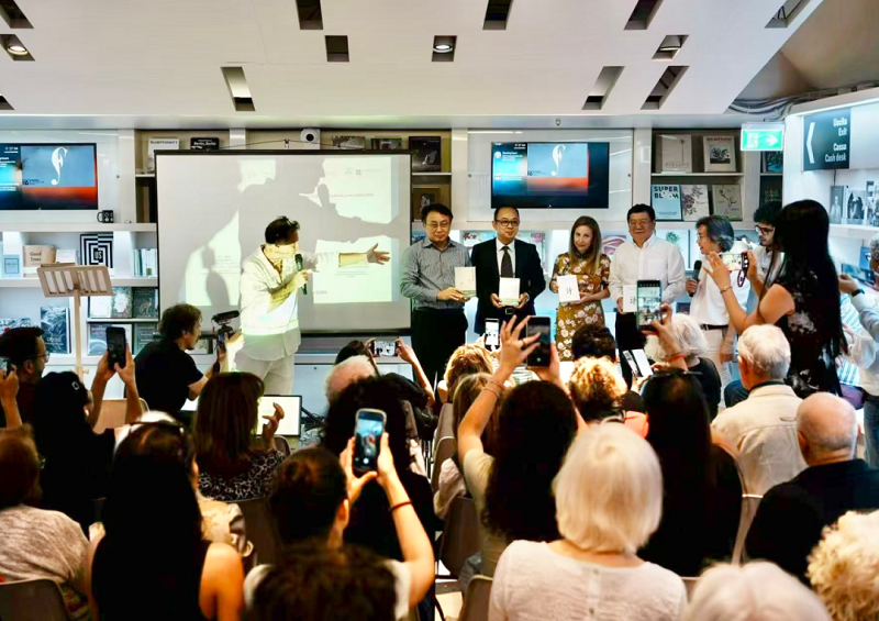 張凌霄參贊、胡曉東副總經理、瓦倫蒂娜·基亞雷莉和張在健社長為新詩集揭幕