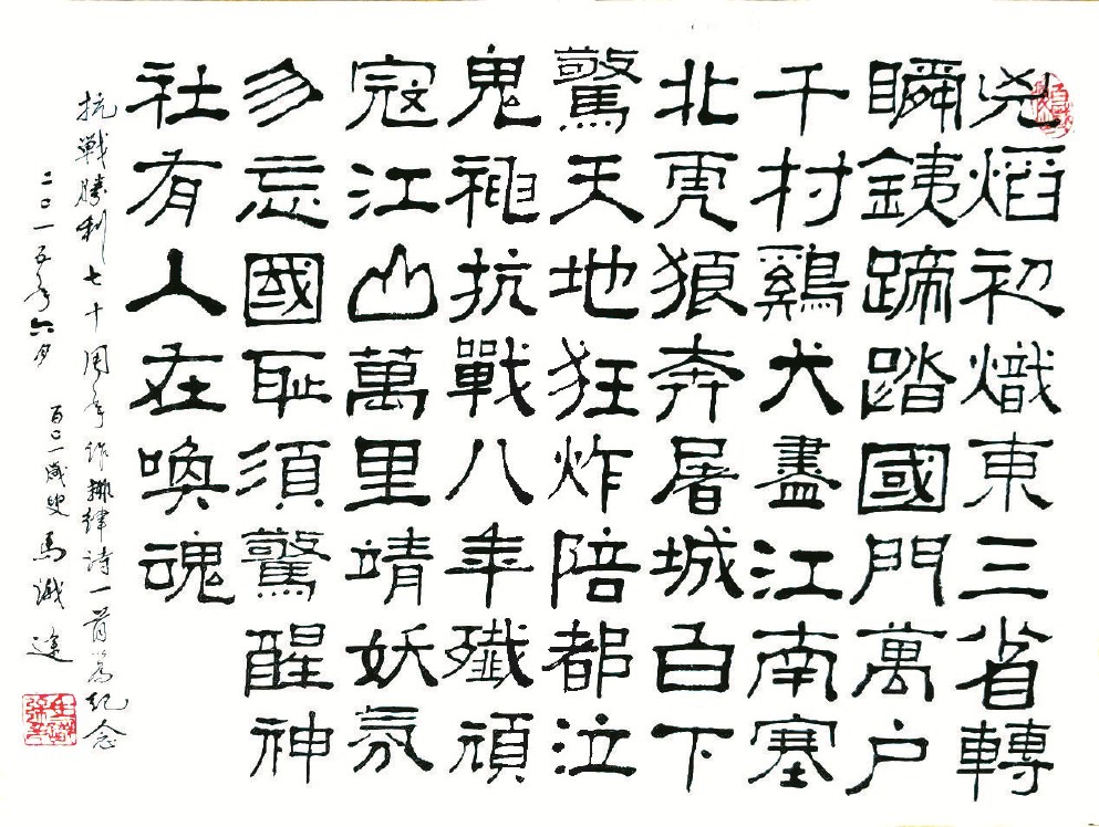2024年8月,中國現代文學館曾主辦“浩然正氣——馬識途書法展”。在展覽中,中國現代文學館特意從字畫庫珍選了馬老極具代表性的書法作品,其中就有他在抗戰勝利70周年時所書的詩句,這幅書法是時年100周歲的馬老寫于2015年6月。兇焰初熾東三省,轉瞬鐵蹄踏國門。萬戶千村雞犬盡,江南塞北虎狼奔。屠城白下驚天地,狂炸陪都泣鬼神??箲鸢四隁烆B寇,江山萬里靖妖氛。勿忘國恥須驚醒,神社有人在喚魂。