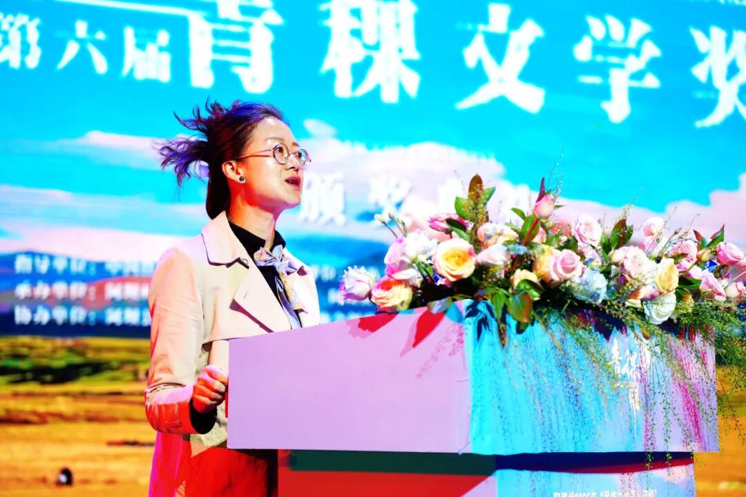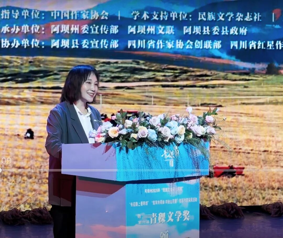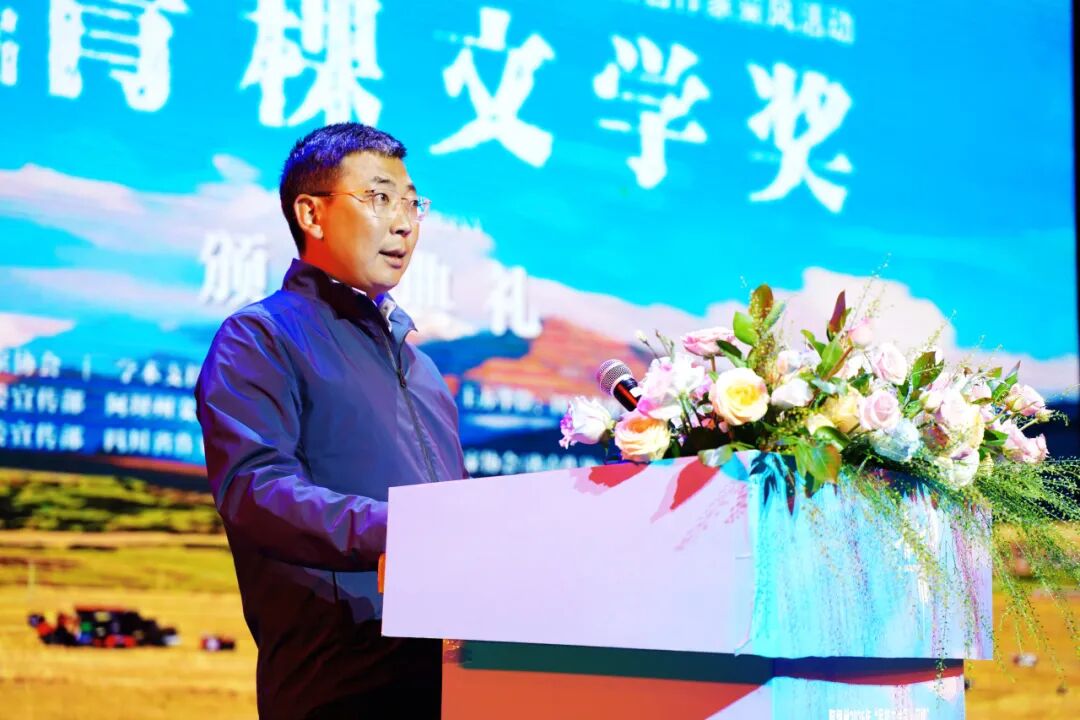 依當措在致辭中說,青稞生于苦寒,長于風霜,卻結出滋養生命的果實。以它命名的文學獎,亦承載著在蒼茫高原之上,寂靜生長,文字如穗,漸成信仰的精神。阿壩州地處青藏高原東南緣,是全國唯一的藏族羌族自治州。這里有“童話世界”九寨溝、“人間瑤池”黃龍、中國戶外第一山——四姑娘山、若詩若畫若爾蓋大草原、東方的魔幻世界蓮寶葉則等世界知名景點,是全球擁有世界自然遺產數量最多的地區之一,是生態文明示范地、長江黃河上游重要的生態屏障和水源涵養區。這里是多彩人文綻放地。紅軍長征在阿壩創造了駐留時間最長、召開重要會議最多、軍民關系最濃厚等“七個之最”,留下了“牦牛革命”的動人詩篇。全州擁有羌年等4項世界級非遺,有各類不可移動文物2132處,國家級非遺項目23項、省級非遺項目101項,被譽為“民族文化大走廊”“露天歷史博物館”。這里,是文旅發展引領地。黃龍成功入選世界自然保護聯盟綠色名錄,成為全球最佳自然保護地之一,桃坪羌寨是全省唯一的世界最佳旅游鄉村。誠摯邀請各位作家老師們,常來阿壩行走、采風、書寫。讓你們的筆觸,深入牛羊漫步的牧場、阡陌縱橫的山村,真正走進各族群眾火熱的現實生活,走進高質量發展的生動實踐,講述阿壩的故事,讓更多的人通過文學作品了解阿壩、認識阿壩、走進阿壩、愛上阿壩。