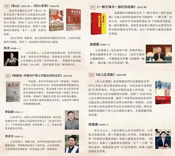 中國特色社會主義新時代以來,山東抗戰文學抒寫呈現多元視角與精神傳承。鐵流的長篇紀實文學《靠山》全景式呈現了革命年代人民群眾踴躍支前的動人場面,獲第十六屆精神文明建設“五個一工程”優秀作品獎。李延國、李慶華的長篇紀實文學《根據地:中國共產黨人不能忘卻的記憶》被中宣部《黨建》雜志全文轉載,獲第六屆徐遲報告文學獎,成為黨史學習教育的重要輔導讀物。高建國的長篇紀實文學《一顆子彈與一部紅色經典》獲第六屆徐遲報告文學獎。還有徐錦庚的報告文學《臺兒莊涅槃》、趙德發的長篇小說《大海風》、楊文學的長篇紀實文學《百年沂蒙》等一系列優秀作品,真實反映了山東地區軍民的戰斗生活,以文學的方式深入全民抗戰的歷史,續寫了抗戰題材文學創作的嶄新篇章。