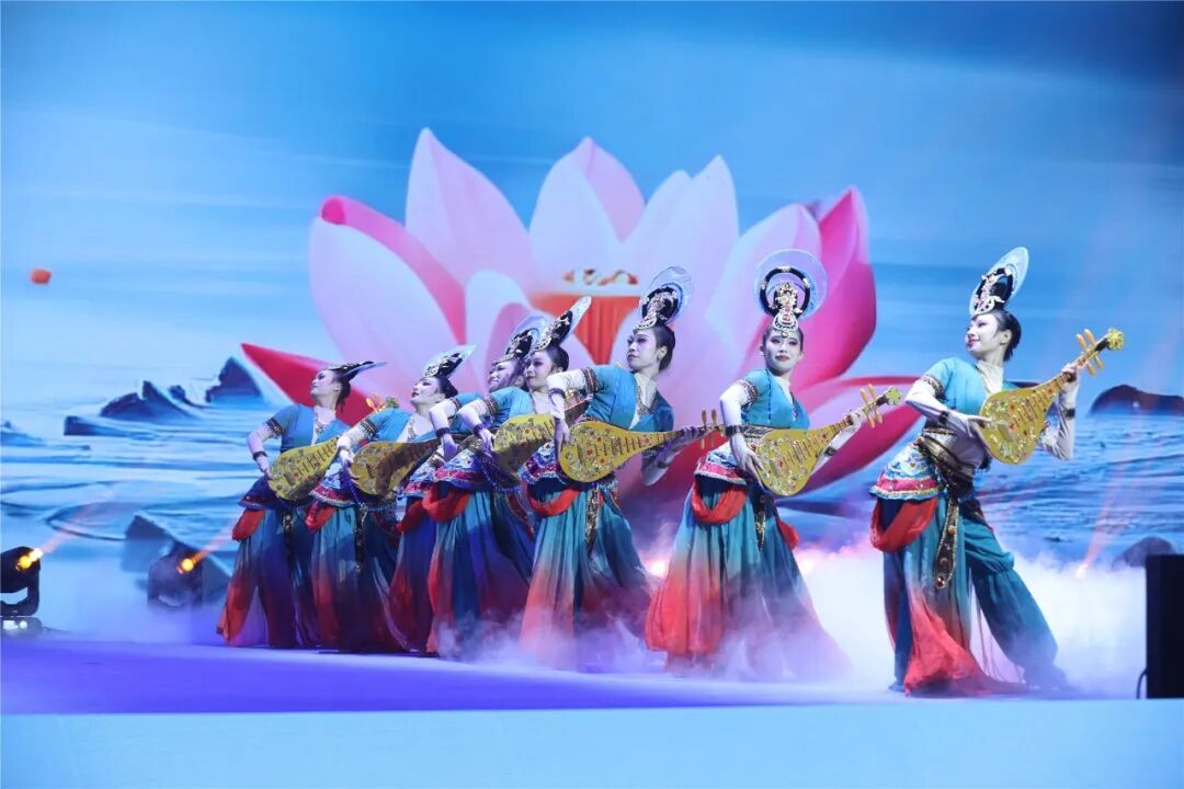 如果說《天下朋友》演繹的是一出熱忱好客的迎賓曲,那么唐代詩人白居易《琵琶行》開篇“主人下馬客在船”表達的就是一份希望遠方賓朋多留片刻的真摯情感。千年之前,白居易到潯陽江邊送客,因江面上傳來一陣琵琶聲留住歸程,也成就了“音樂詩中的千古絕唱”?!讹L起東方》旋律響起,十余位舞者身著初唐時期較為普遍的雞心領短襦和青色合歡袴,手持金色琵琶,在舞臺上翩翩起舞。在舞蹈節目《琵琶行》中,舞者們迎風擺動的衣裙,飄飄翻卷的彩帶,仿若從盛唐時期敦煌莫高窟的飛天圖壁畫中走出來,走進不夜長安的詩歌狂歡。弦音流轉間,“嘈嘈切切錯雜彈,大珠小珠落玉盤”的意韻猶在;琵琶聲聲響,傳遞出跨越山海的詩意和鳴。