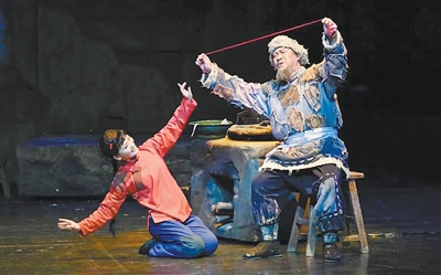 2015年版《白毛女》演出劇照,蔣寧飾喜兒,高鵬飾楊白勞。