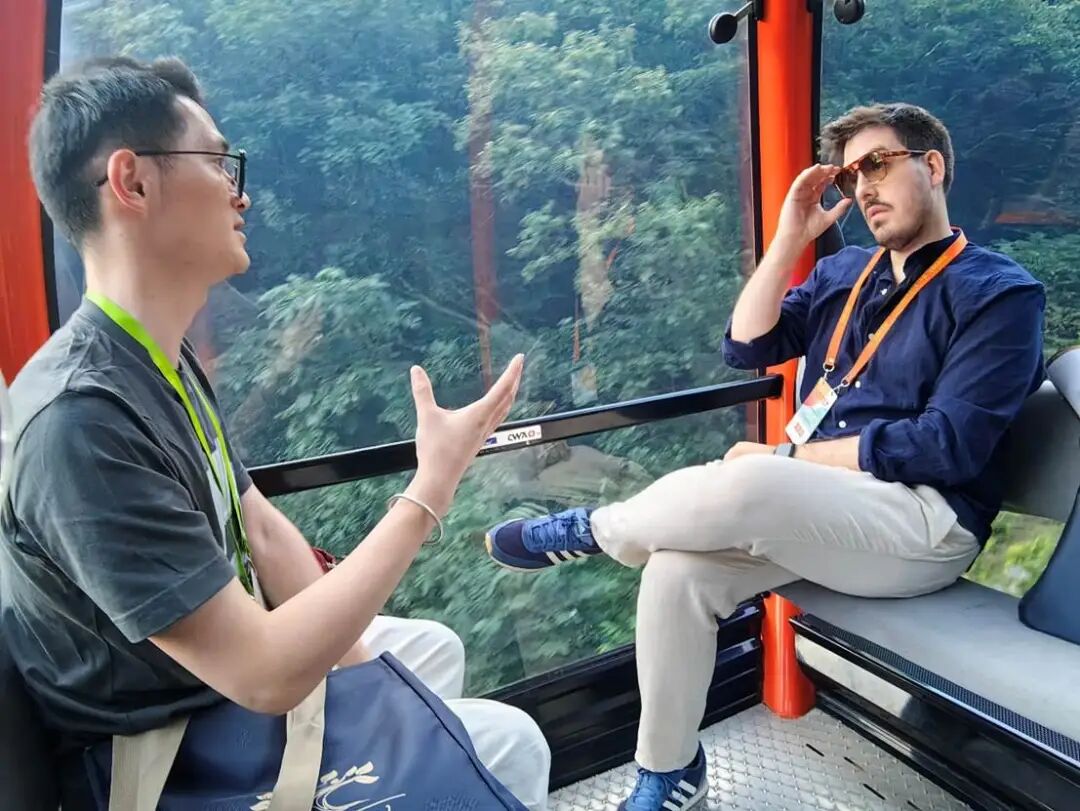 乘坐纜車期間,活動志愿者馮凌鋒為阿根廷詩人馬克西米利亞諾·萊尼亞尼講解中國文化。陳澤宇 攝。