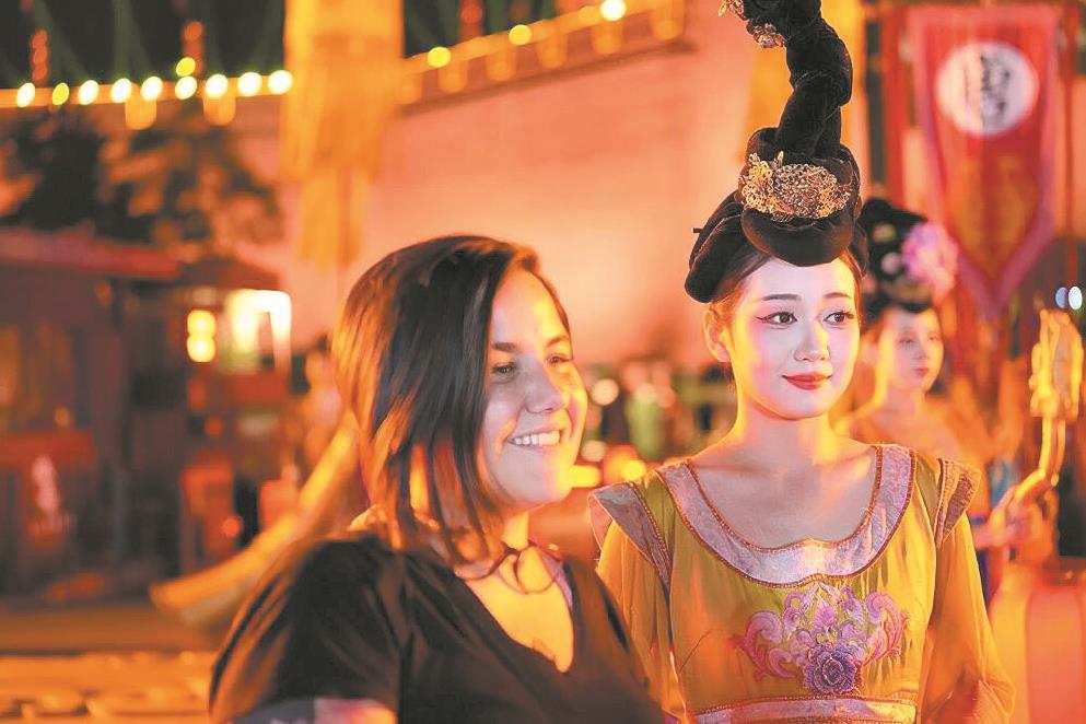 玻利維亞詩人杰西卡·弗羅伊登塔爾與“唐代仕女”合影。(主辦方供圖)