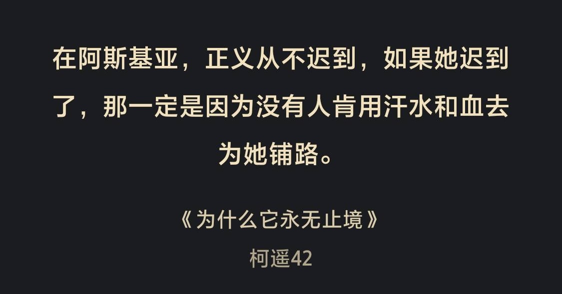 柯遙42:是的,這是我工作以后一直在咀嚼的問題,所以會很自然地反映在我的小說里。這個龐然大物,人一旦給它命名,它就立刻標簽化,變成令人生厭又司空見慣的陳詞濫調。但實際上它幾乎像空氣一樣彌散在我們的日常生活里——它可以是看不見的天花板,是無聲的法庭,是從未有人宣布但人人遵守的游戲規則,是社群在無意識中投射的期待。任何試圖否定它的人,都將加倍承受它的重量?,F在這本書已經256萬字了,《永無止境》是我對這個問題拿出的第三份答案了,故事目前仍朝著我預設的方向在走。