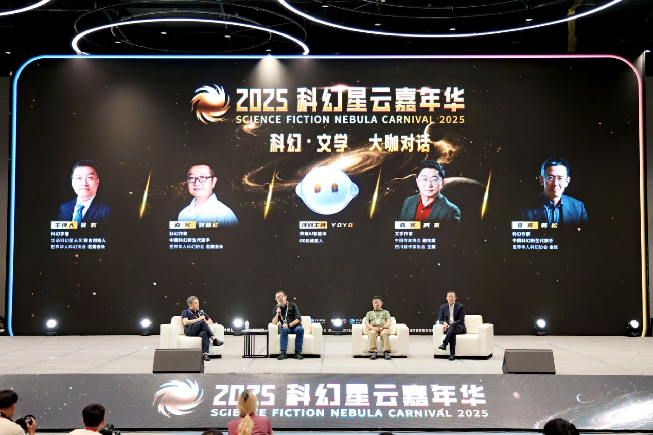 9月20日下午,本次嘉年華的重要活動——“科幻·文學大咖對話”在成都科幻館舉行。中國作協副主席、四川省作協主席、茅盾文學獎獲得者阿來,科幻作家劉慈欣、韓松,圍繞“人工智能與科幻未來的交融與想象”展開對談?;顒佑赡戏娇萍即髮W教授、華語科幻星云獎聯合創始人吳巖主持。值得一提的是,本次活動上,還有一位神秘嘉賓“OO后硅星人”——榮耀AI智能體YOYO,為大會增添了科幻色彩。