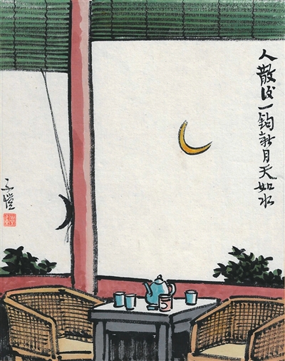 之所以是“古詩新畫”,在于豐子愷在研讀古代詩文時,真切感受到其穿越時間的魅力。宋代蘇軾提出“詩畫本一律”之說,明確了詩畫相通的理論。豐子愷在《畫中有詩》自序中談道:“余讀古人詩,常覺其中佳句,似為現代人生寫照,或竟為我代言。蓋詩言情,人情千古不變,故好詩千古常新?!本拖衿涑擅鳌度松⒑?,一鉤新月天如水》,就源于宋代詞人謝逸《千秋歲·詠夏景》中的最后一句。