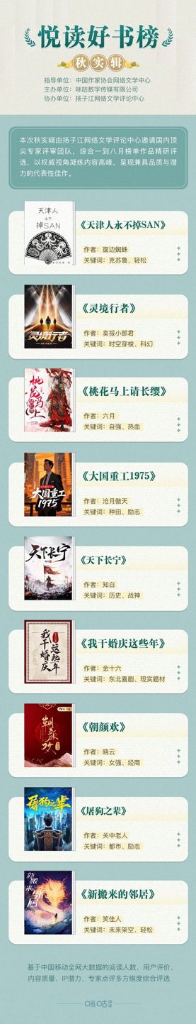 “悅讀好書榜”由中國作家協會網絡文學中心指導,咪咕數字傳媒有限公司主辦、揚子江網絡文學評論中心協辦,按月發布。上榜作品均基于咪咕閱讀的中國移動大數據篩選推薦及權威評論家遴選。截止目前,上榜圖書在全網累計收獲上億曝光,總計入選的64部作品中,16本已進入影視化改編階段,23本改編為有聲書,12本已出版或進入出版階段。眾多榜單作品在較短的上線周期內,迅速積累起高人氣,并受到影視行業的密切關注。