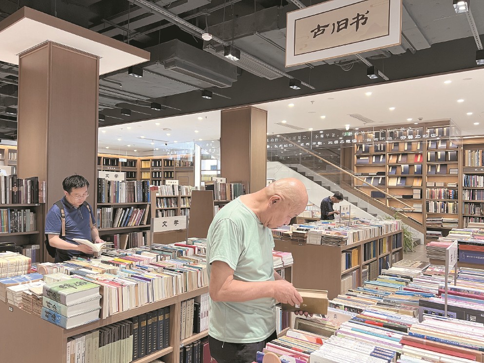 書店三樓既有按經、史、子、集分類陳列舊版線裝書的“博古齋”,又有匯集舊書的“淘書樂園”,還有定期開張的屋頂舊書市集?!锻崴股倘恕贰栋屠枋ツ冈骸贰栋倌旯陋殹贰罅客鈬膶W作品,吸引了陸先生駐足。他說,在書店翻實體書、淘舊書和線上看電子書的感覺是不一樣的,“更有開盲盒的驚喜感”。上海圖書公司副總經理程犁告訴記者,舊書市集除了購買圖書,還結合講座、展覽、工作坊等多種形式,增加市集互動性和教育性,不斷下沉至全市各街鎮社區,精準對標愛書人文化需求,將書送到“最需要的讀者身邊,市民的家門口”。