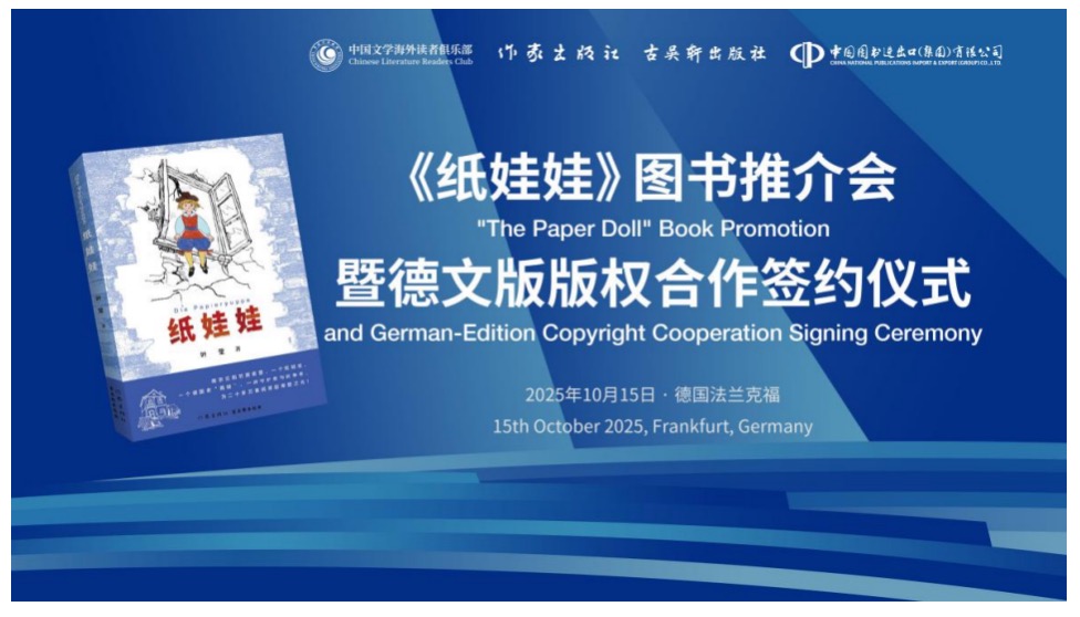 近日,由中國作家協會外聯部指導,德國中國文學讀者俱樂部、作家出版社、古吳軒出版社、中國圖書進出口(集團)有限公司聯合主辦的《紙娃娃》圖書推介會暨德文版版權合作簽約儀式在德國法蘭克福書展期間舉行。本次活動以“跨越時空的和平敘事”為主題,匯聚中德出版界、作家、翻譯家及媒體代表,以兒童的視角,講述了世界反法西斯戰爭中的大愛故事?;顒佑陕玫略娙?、作家昔月主持,作家葉瑩以視頻方式參加活動。